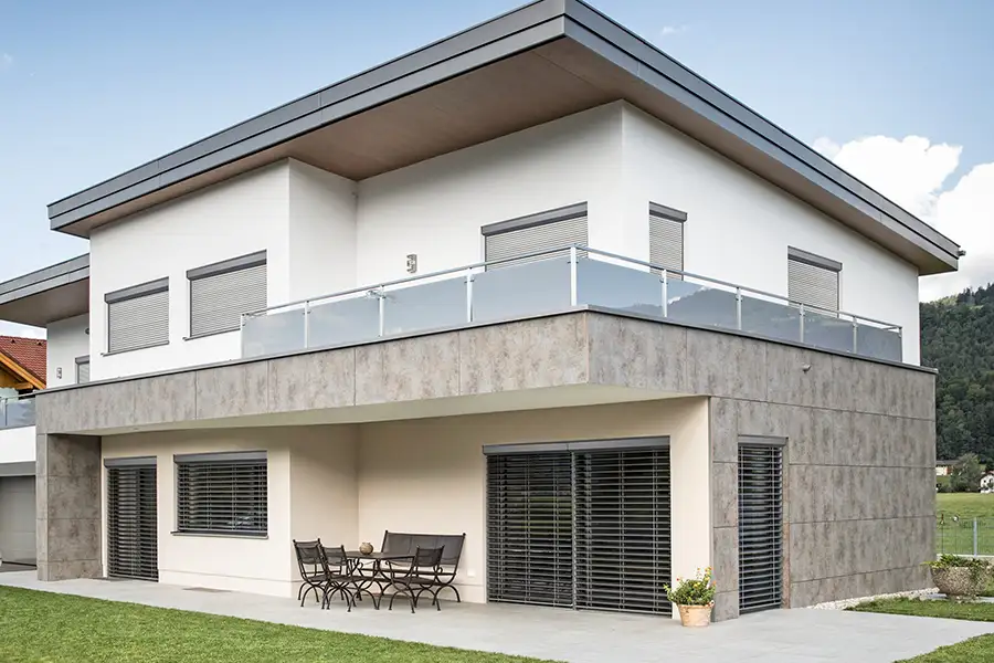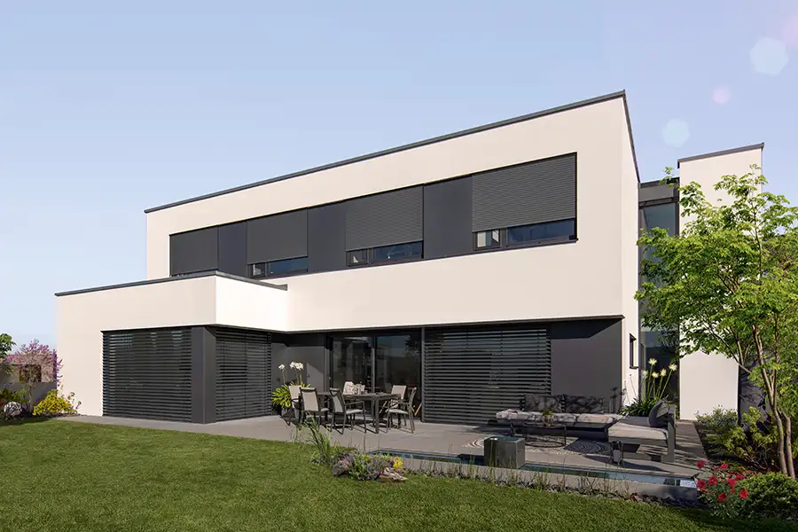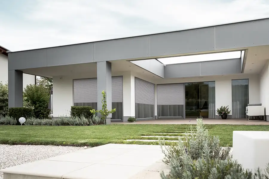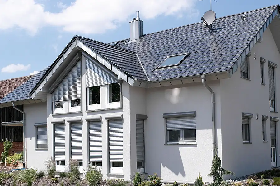 In vielen Fällen können Rollladen‑Profil und Führungsschienen farblich unabhängig voneinander gewählt werden. So entstehen entweder Ton‑in‑Ton‑Lösungen oder bewusst gestaltete Kontraste, zum Beispiel anthrazitfarbene Führungsschienen zu hellen Lamellen.